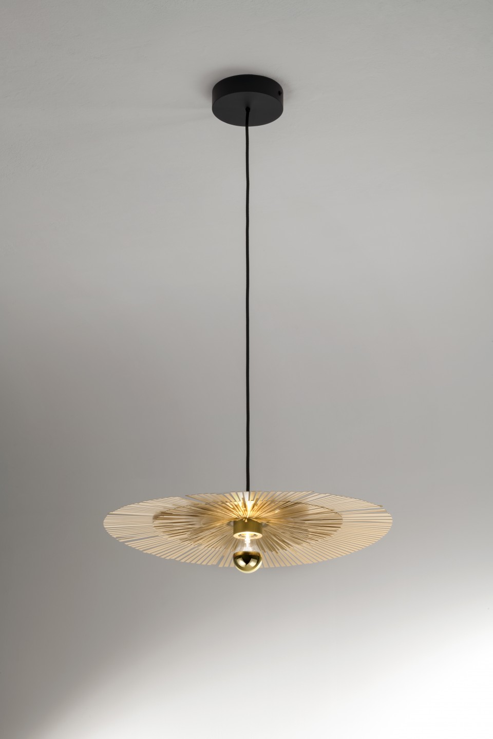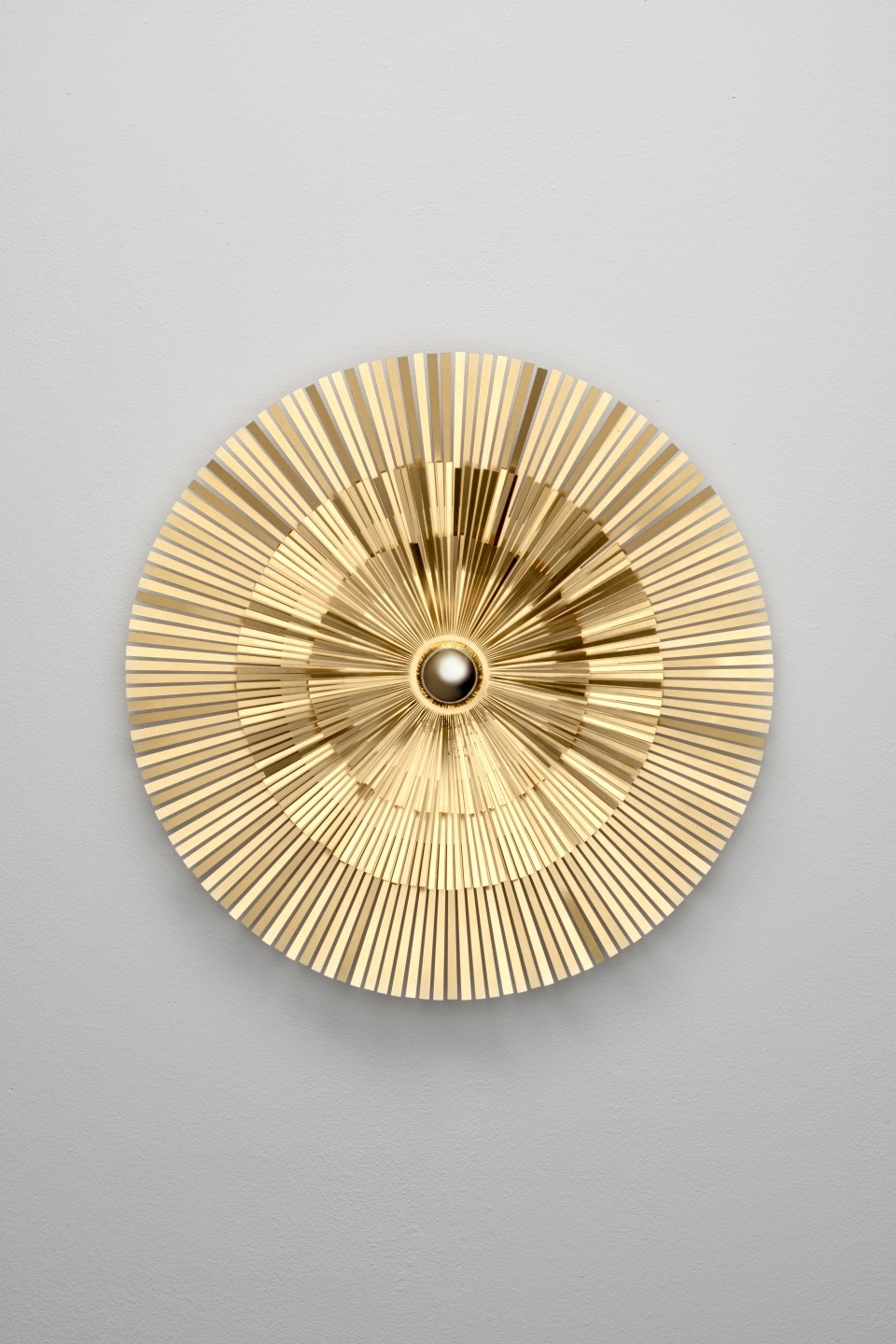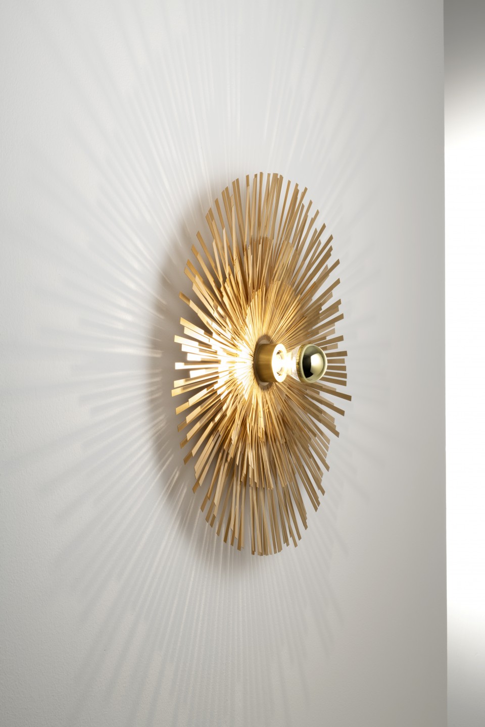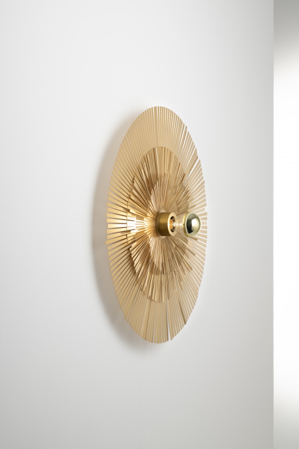 Available in two versions, wall-mounted and suspended, Lafayette is a tribute to the France of the Sun King and to 19th century Paris, but it is also a refined reference to the recent renovation of the facade of the Louis Vuitton store in Place Vendôme designed by archistar Peter Marino. It is a brass lamp with pure shapes, composed of multiple thin strips of metal which the end user can shape any way he or she desires. The spokes can be opened for a more scenographic appearance or kept flat for a more minimalist look.