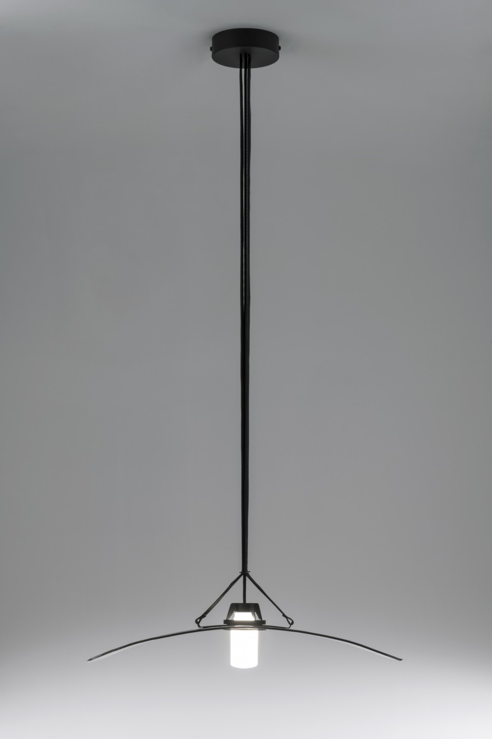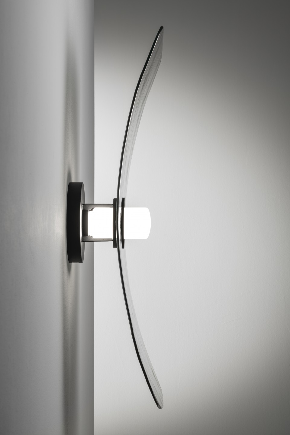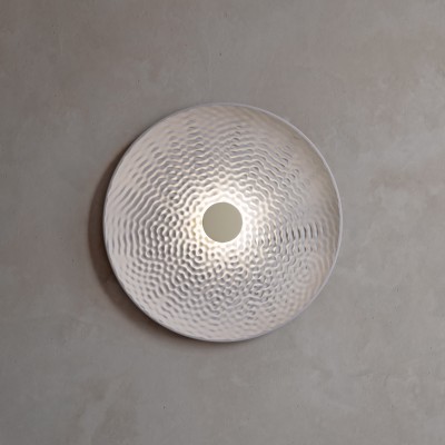 Solar is declined in two versions, ceiling and wall lamp. The diffusor is made in a sheet of thermoformed glass which is supported by a fabric belt in the ceiling version, while the wall lamp can be mounted horizontally or vertically onto a base in matt black powder-coated metal. The LED light source can be dimmed and is contained within a hand-blown opaline glass diffusor.
