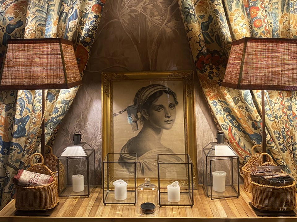 Layered canopies and enveloping prints transform the room into a protected inner world,
