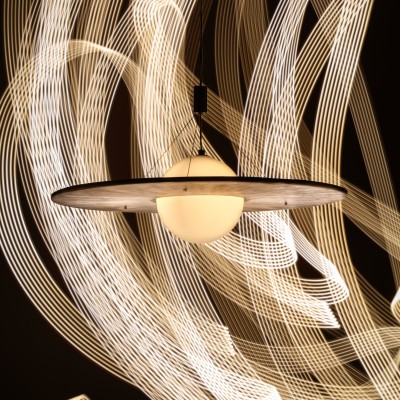 Il design è ridotto a un gesto d'impatto: un disco di alluminio sospeso, forato al centro da una sfera di vetro che sembra fluttuare senza peso. La sorgente luminosa è racchiusa all'interno di questo nucleo trasparente, mentre il disco fluttua nello spazio, ancorato da cavi sottilissimi.